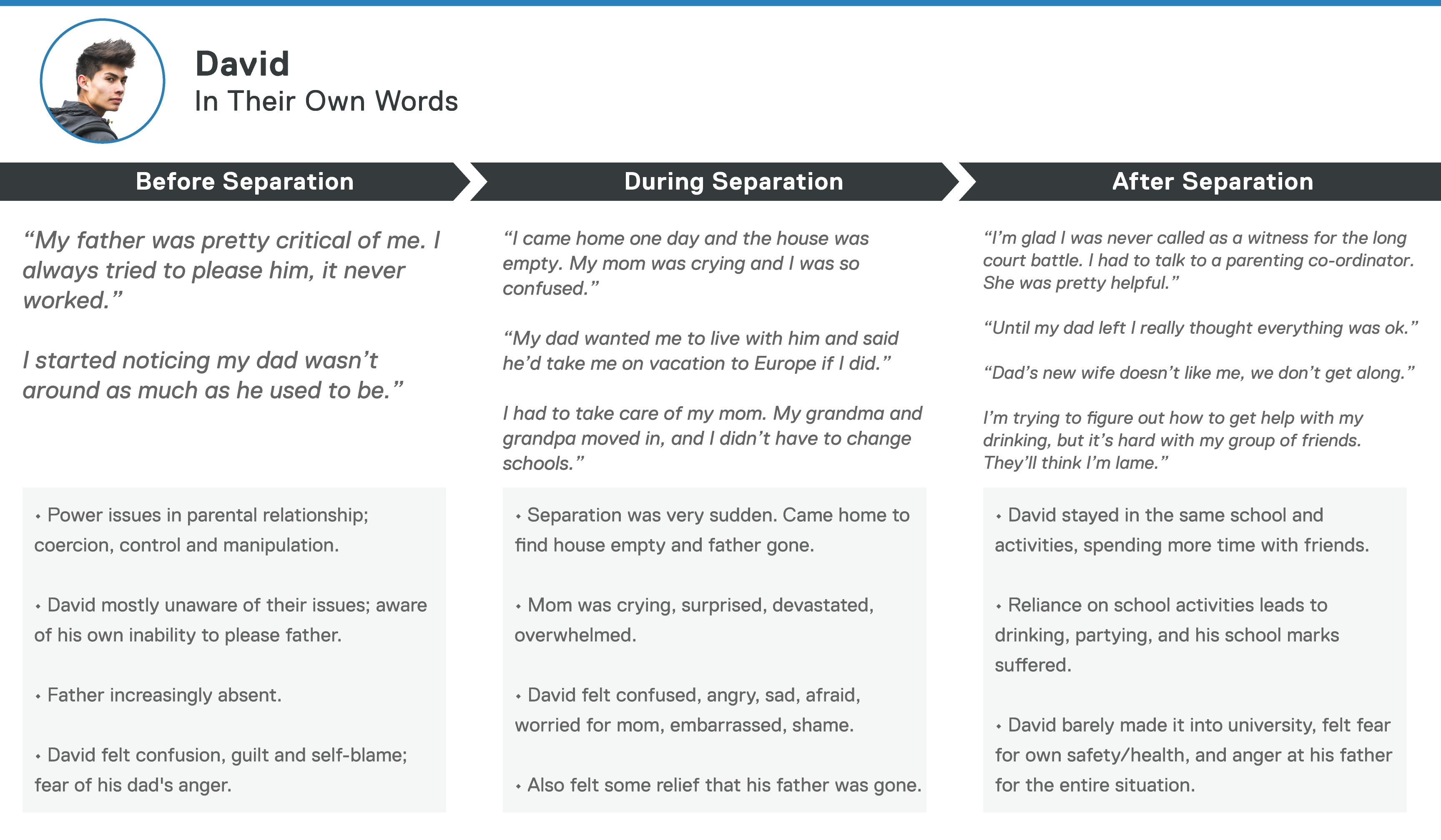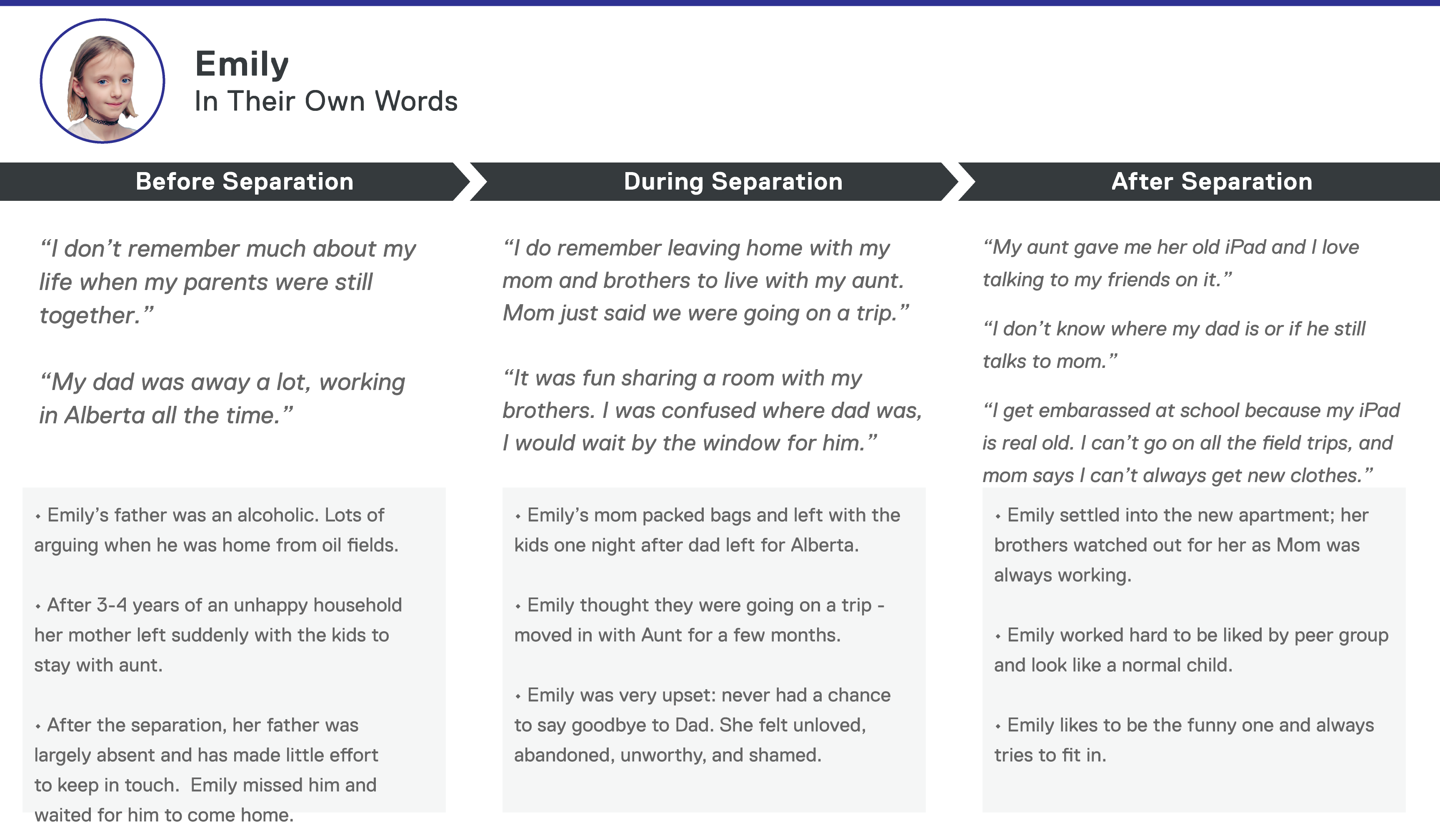 - In their own words: A page with quotes and more information about the parents’ journey through separation (as this may not always be known by the child)